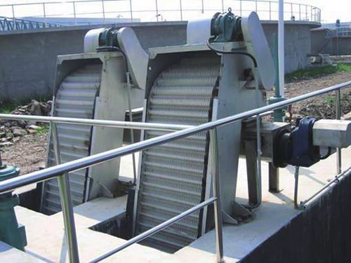 该设备釆用回转式,由一种特殊形状的犁形耙齿按一定的装配顺序的数量排列在横轴上,组成耙齿链,根据过水流量,装配成不同的间隙,安装在泵站或水处理系统的入口处,当驱动装置带动耙齿链自下向上运动时,水中的杂物被耙齿链捞起,液体则在栅隙中流过,设备转动到上部顶点后,耙齿链改变运行方向,由上向下运动,物料依靠自重从耙齿上自行脱落,当耙齿从反面转到底部时,又开始另一循环往复的连续运行,从而不断的从水中清捞杂物,达到固液分离的目的。